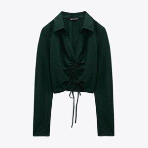 Zara Dark Green Collar Scrunch V-Neck Cropped Long Sleeve Blouse Top Shirt Small