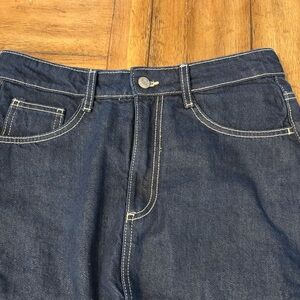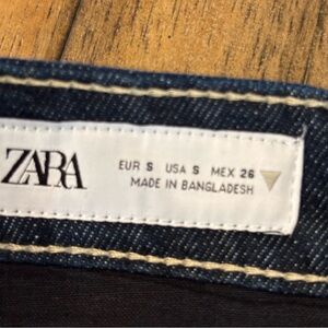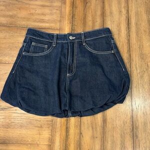 Zara Denim Balloon Mini Skirt in Dark Indigo, Small, Five pocket mini skirt with a mid waist and belt loops. Contrasting seam detail.
