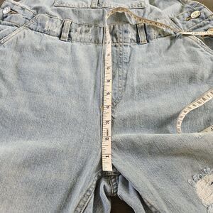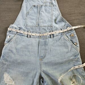 These Zara Denim Bib Overalls are a versatile and stylish option for women looking for a casual yet fashionable look. Made from cotton denim in a solid light wash blue, these one-piece overalls feature a square neckline, sleeveless design, and button closure. Straight leg style and a distressed front. Small mark on back of right leg as shown. Otherwise is great condition! See pictures for measurements