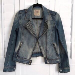 Elevate your style with this chic blue studded denim jacket. Perfect for adding an edgy touch to any outfit.
