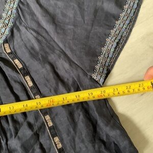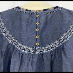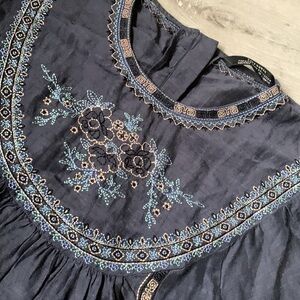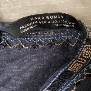 Zara Denim Peasant Embroidered Floral Linen Blend Top Blouse Size Xs