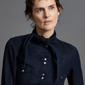Zara Denim Snap Button Shirt Cotton Dark Wash Jean Shirt Tie Collar Dagger M