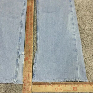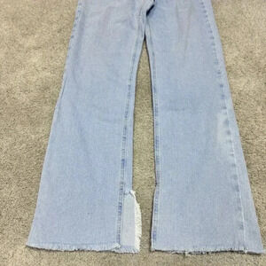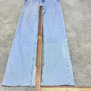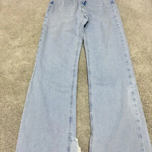 Classic straight leg jeans. Light blue denim. Frayed hem adds style. Ideal for everyday wear.