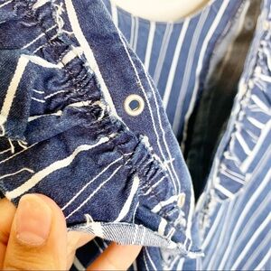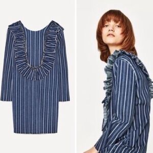 Zara Denim Striped Fringe Bib Long Sleeve Mini Dress Size XS