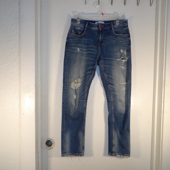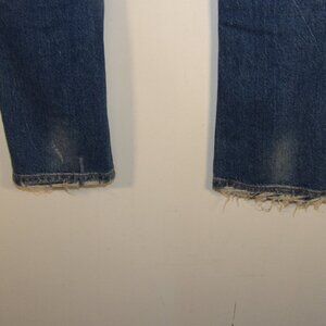 skinny to straight leg , medium wash , well worn showing wear on edges of pockets and waistband , hems well frayed crotch is good , Working hardware and belt loops intact , 99% Cotton 1% Elastane , Size 4 rise measures 10" inseam measures 28" waist lying flat measures 16" , Decent Used Condition and well worn but free of stains , pet friendly non smoking home