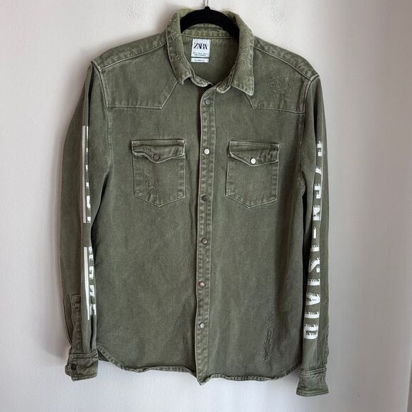 Stylish Zara shirt jacket in khaki green. Features buttoned chest pockets and bold sleeve lettering. Ideal for layering.