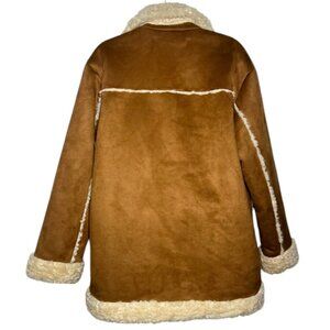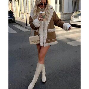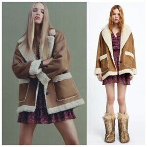 Zara Double Faced Coat Boxy Patch Pockets Faux Sherpa Faux Suede Brown S