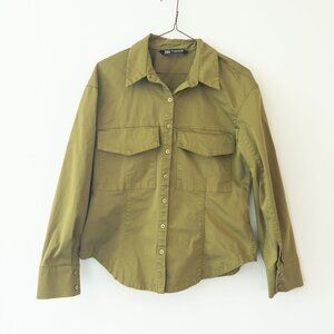 Zara green double pocket career office button up long sleeve shirt in a size medium. The fabric is sturdier than a normal top, almost a jacket hybrid.