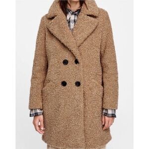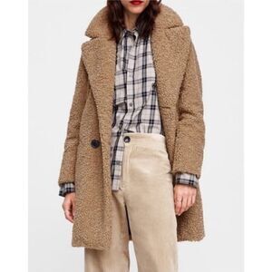 Zara Double-Breasted Teddy Coat in Camel Size XL. In great condition, inner label is worn and detached a little as pictured, but no other signs of wear.