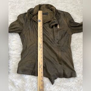 👉🏻 Feature a draped front and a side zipper, creating a cowl neck when zipped up. It is made from a soft, suede-like material.