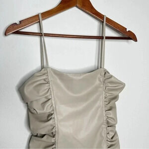 New with tags. Zara Draped Faux Leather Cream Mini Dress Blogger Fave. Some discoloration and loose threads on the back as shown in pics. Size small.