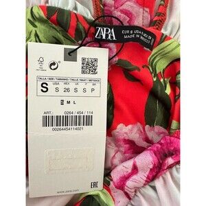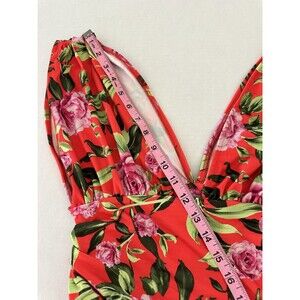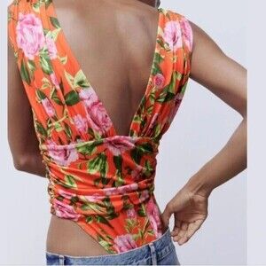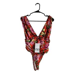 Zara Draped Floral Bodysuit Women Size M Red Pink Green V Neck