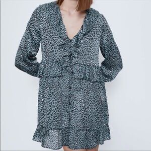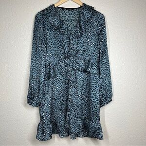 Zara Dress Animal Print Blue Leopard Ruffle Women’s Size Small Cocktail Party.
