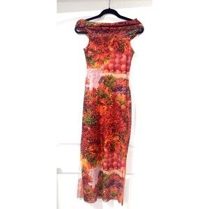Zara Dress Medium Off Shoulder Maxi Chili Pepper Fruit Print Mesh Stretch NEW