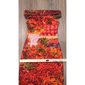 New with tags. No noted flaws. Zara off-shoulder maxi dress in a bold chili pepper and market produce print. Features a body-hugging silhouette, stretch mesh overlay, side slits, and bright multicolor design. Approx. 47 from shoulder to hem (length can fit as midi on taller heights and maxi on shorter heights).