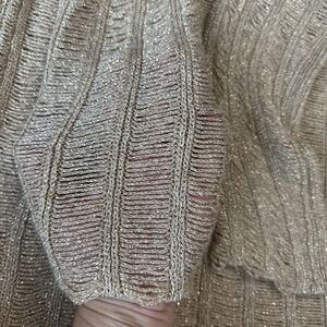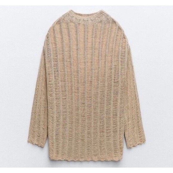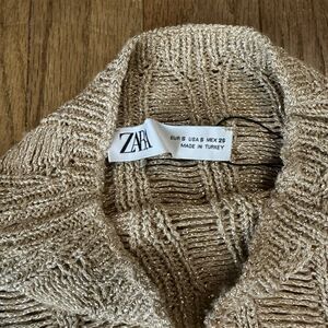 zara, womens dress, sweater dress, crochet dress, gold dress, small dress, metallic thread dress, loose knit dress, a-line dress, sheer dress, y2k fashion, boho chic, festival fashion, sustainable fashion, pre-owned dress, vintage dress, long sleeve dress, mock neck dress