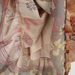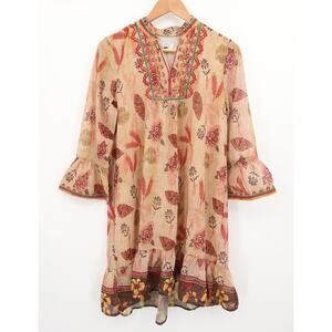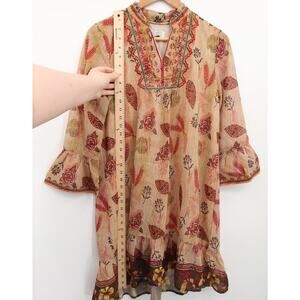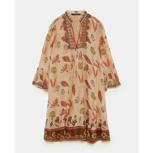 Embrace a boho vibe with this stunning Zara dress featuring a tan leaf floral pattern in nude beige. The dress showcases beautiful bell sleeves and an embroidered neckline, adding a touch of elegance to your casual wardrobe. With a flattering V-neck and ruffle details, this tunic-style dress is perfect for any occasion, from brunch to beach outings.