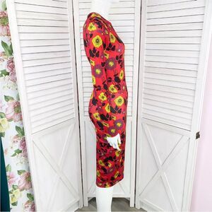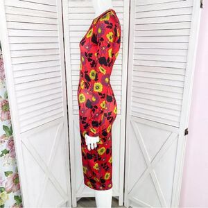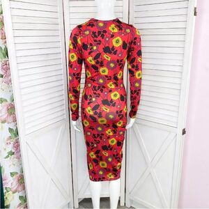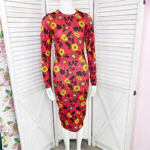 Zara Dress Womens Small Red Yellow Floral Bodycon Midi Stretch Long Sleeve