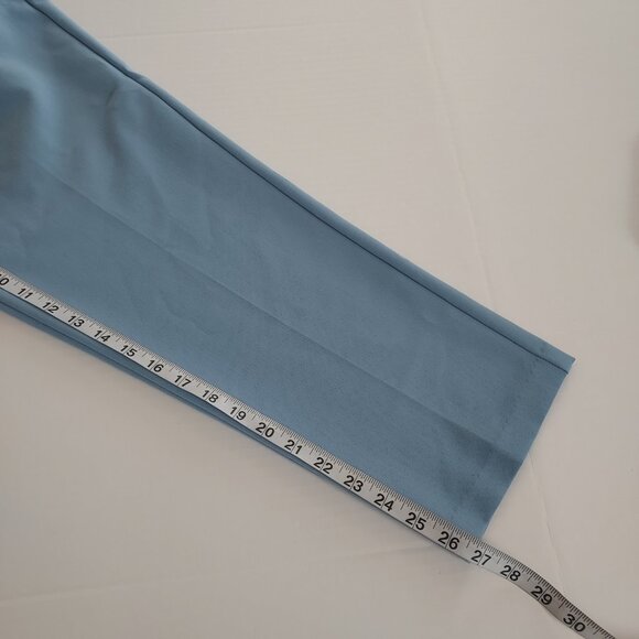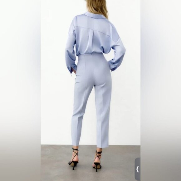Size large Zara Dusty Blue High Waisted Straight Leg Pants. 73% polyester 21% viscose 6% elastane. High waisted pants with pronounced seams at front and back. Front welt pockets. Zipper, metal hook and inside button front closure. Waist 15" Rise 13" Inseam 26.5" Excellent pre-owned condition