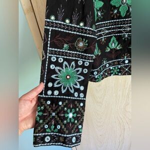 Gorgeous all over embroidery with mirror accents. Excellent condition except the embroidery does have loose thread here and there. See pics. It’s not falling apart. 85: just the nature of the item with so much embroidery
