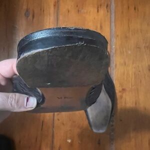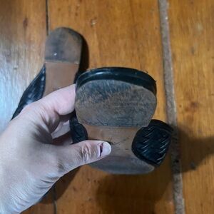 Beautiful black woven slides in a size 41 with a gold bit buckle detail. In good overall shape with some wear (See photos). No odor. Some minor peeling inside. These are a great designer dupe and are reminiscent of the Gucci slides. Nice woven pleated vibe. This is likely faux leather, but I am not sure.