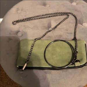 Gorgeous sage green genuine suede with sleek gunmetal wristlet loop can be removed to be worn as a wristlet or as a crossbody or to lengthen the crossbody