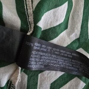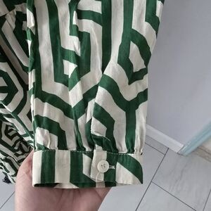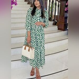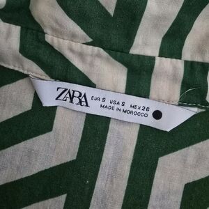Embrace resort elegance with this Zara sundress, featuring a vibrant green and white geometric pattern. Designed with a crew neck and long sleeves, this dress offers a chic and comfortable fit for warm weather. Its flowing silhouette and airy fabric make it an ideal choice for a stylish getaway.
