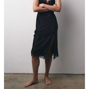 Sophisticated black midi dress with delicate lace details. Features a flattering slit. Ideal for special occasions.