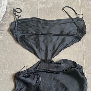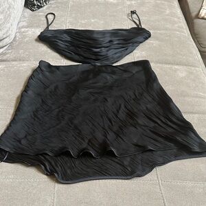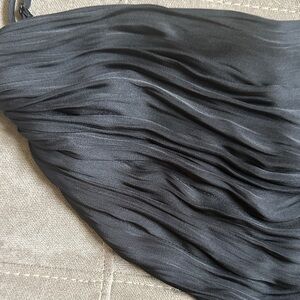 Chic black ruched top with delicate straps. Ideal for a sophisticated look.