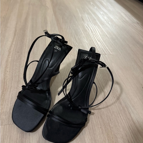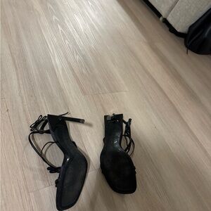 Chic black heels with strappy design. Ideal for versatile styling.