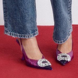 Vinyl slingback shoes. Front rhinestone embellishment.