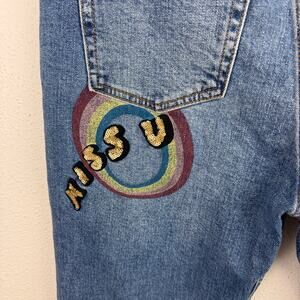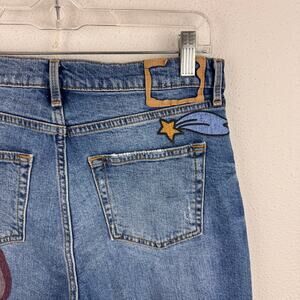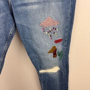 Stretch denim, embroidered & painted details, zip fly with button closure, distressed, size 6.