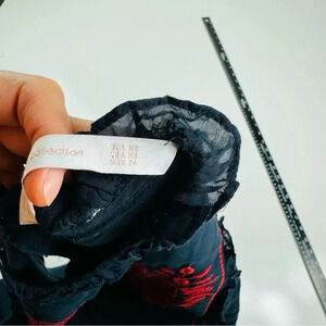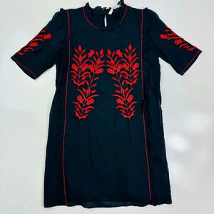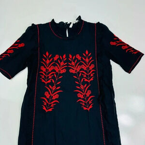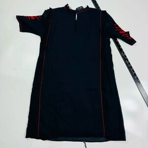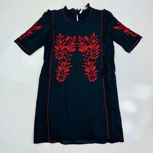 Zara Embroidered Dress Floral Ruffle Trim Black Red Short Sleeve Size XS