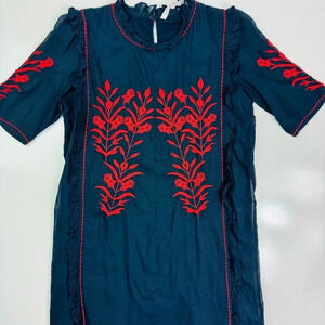 Zara navy blue dress with red embroidered print. Ruffles down to the bottom and around the neck line. Short sleeve. Keyhole enclosure with the button on the back. Lined. Sheath.