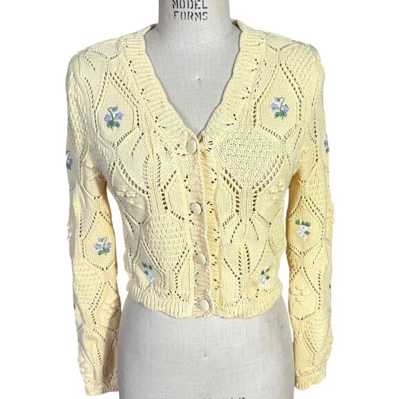 Zara Embroidered Flowers 100% Cotton Cropped Cardigan Yellow Size Small