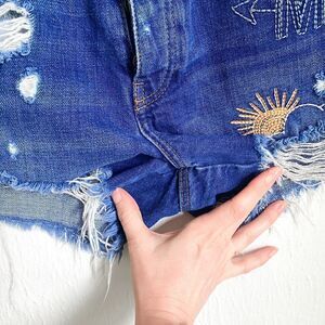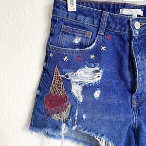 Zara Embroidered Ice Cream Denim Shorts High Rise Button Fly Cut offs US 2.