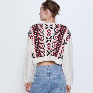 Cropped cardigan with round neck and long sleeves. Ribbed trim. Front closure with lined buttons.