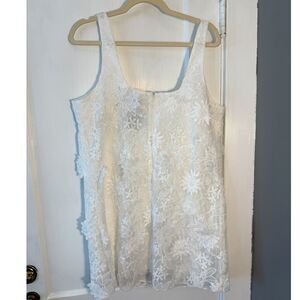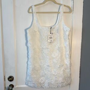 Short dress with a square neckline and wide straps. Floral embroidery detail. Matching viscose lining.