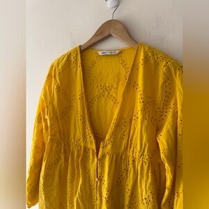 Zara Eyelet V Neck Blouse Tunic Summer Spring Golden Yellow