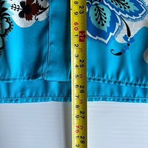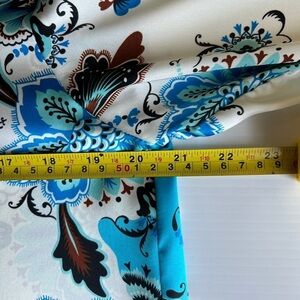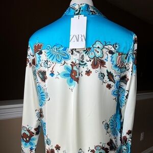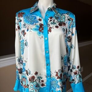 Flowy shirt with lapel collar and long sleeves. Front button closure.
