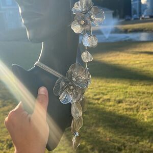 These stunning statement earrings feature intricate silver-tone flowers with a high-shine finish. Each petal is crafted with delicate detailing, adding dimension and movement to the piece. Clear crystals at the center of each flower bring a touch of sparkle, making these earrings perfect for any special occasion.