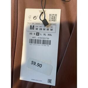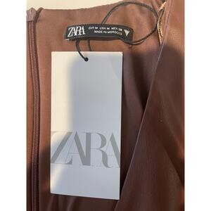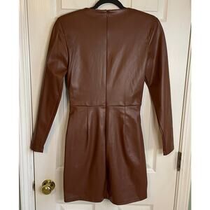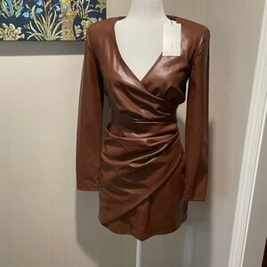 Zara Faux Leather Mini Dress NWT Brown Surplice V-Neck Ruched Long Sleeves Sz M