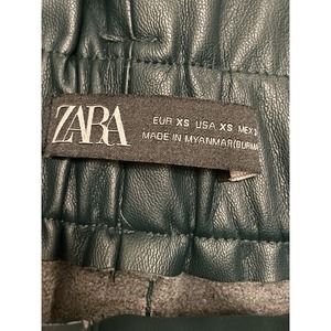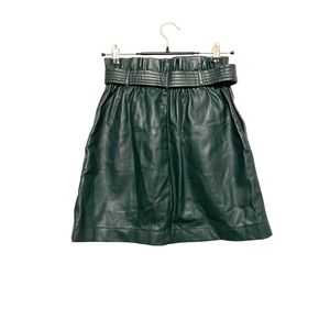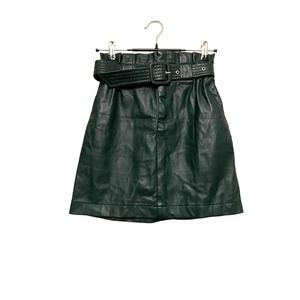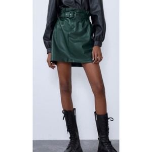Zara Faux Leather Mini Skirt A-line Paperbag Size XS Dark Green Pleather Belted