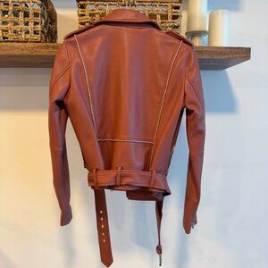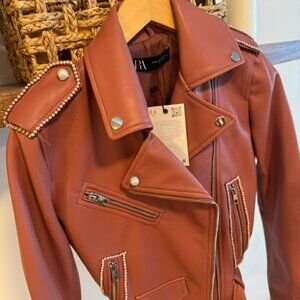 Add an edgy yet feminine touch to your wardrobe with this gorgeous Zara faux leather moto jacket in a warm terracotta hue. Crafted from soft vegan leather, this cropped biker jacket features silver hardware, asymmetrical zip closure, and a waist belt for a flattering fit. What truly sets it apart are the pearl-trim accents outlining the zippers, shoulders, and back seams—offering a chic blend of classic biker attitude and elegant detailing.