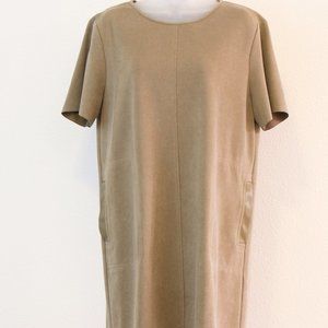 Short olive green faux suede dress with pockets accented with vegan leather. Note the color of the dress on the model is accurate, my lighting is making it look more tan.