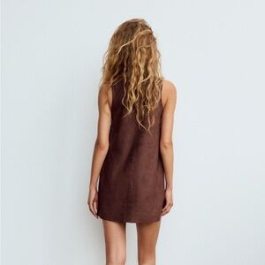 Suede effect fabric dress, round neckline, front false welt pockets, interior lining, side zip closure.