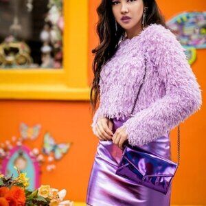 This purple shaggy cropped sweater combines a textured design with a modern fit, making it a stylish addition to any wardrobe. The long sleeves and soft fabric provide comfort, while the unique fluffy texture adds visual interest. Suitable for layering or standalone styling, it offers versatility for varied looks.