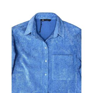 Zara Fine-Waled Corduroy Oversized Blue Button-Up Shirt With Pocket Size XS