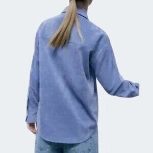 Zara Fine-Waled Corduroy Oversized Blue Button-Up Shirt With Pocket Size XS
