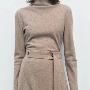 Zara Fitted Wool Blend Mock Neck Top L Women's Long Sleeve Taupe Tan NWT